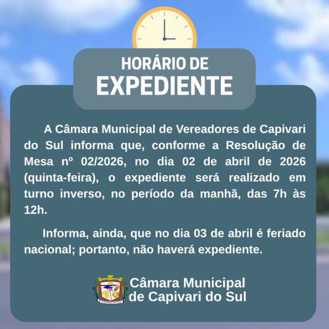 A Câmara Municipal de Vereadores de Capivari do Sul informa que, conforme a Resolução de Mesa n° 02/2026, no dia 02 de abril de 2026 (quinta-feira), o expediente será realizado em turno inverso, no período da manhã, das 7h às 12h.