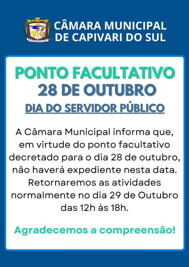 A Câmara Municipal informa que, em virtude do ponto facultativo decretado para o dia 28 de outubro, não haverá expediente nesta data.